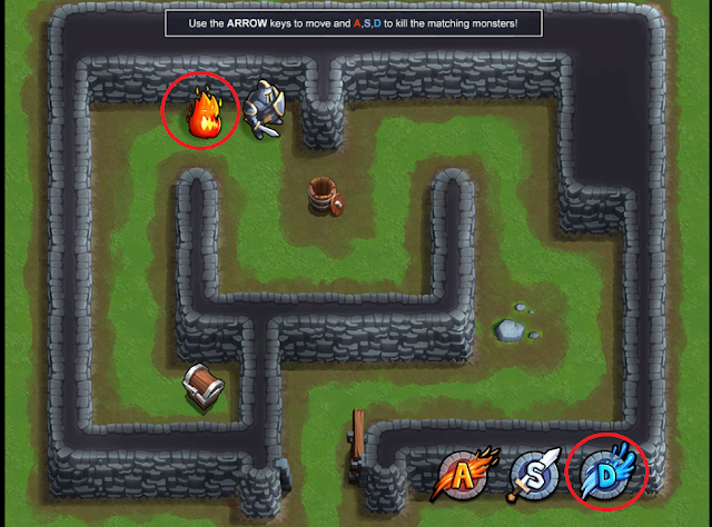 Help the hero to navigate through the maze and reach the chest. Move the knight using ↑ ↓ ← →, and use the right attacks to defeat monsters: slimes with A, skeletons with S, fire sprites with D.